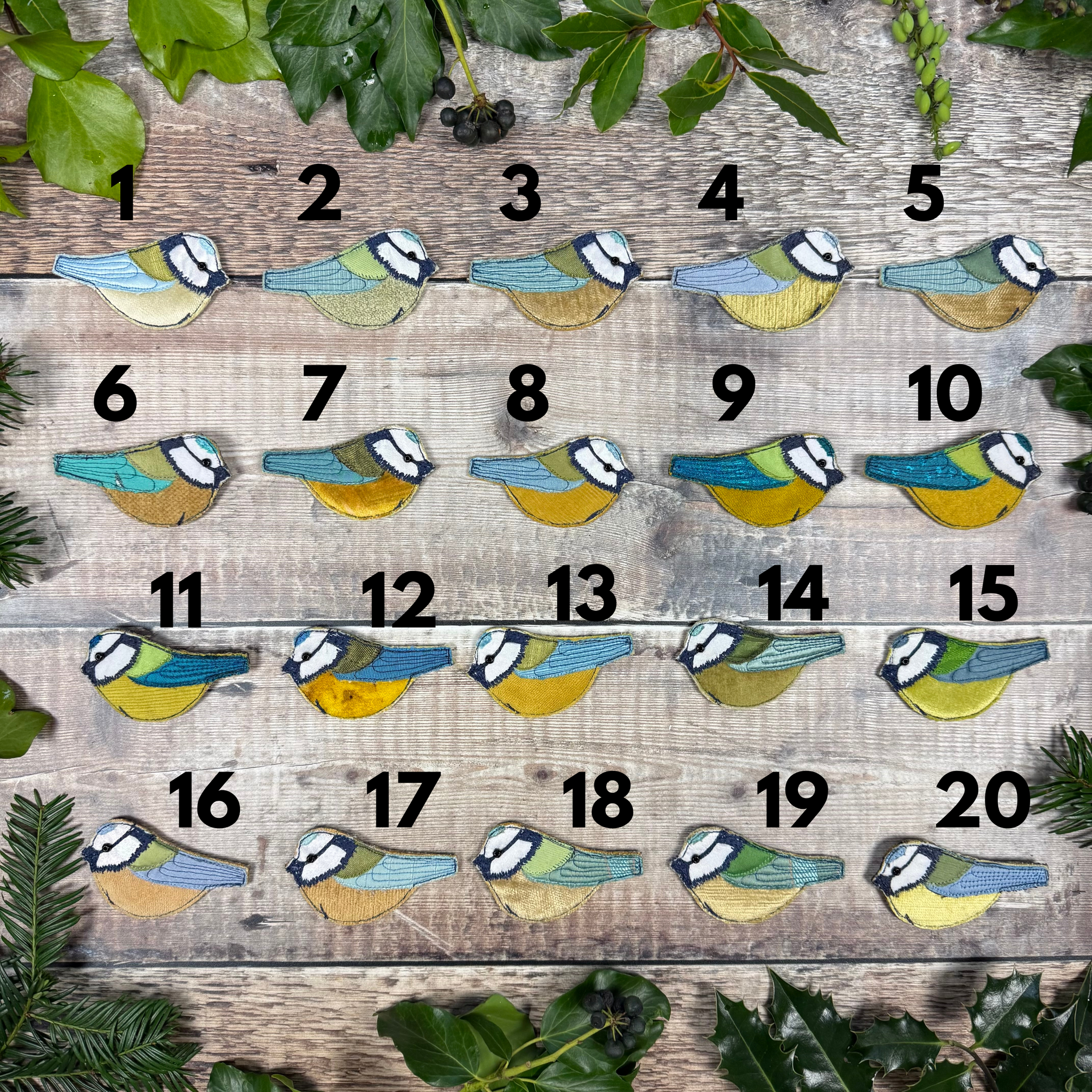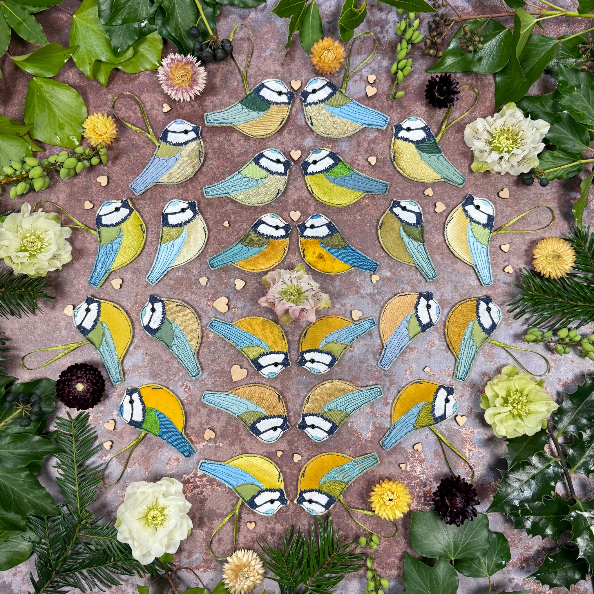 The Blue tits are decorated with machine embroidery and a glass bead for an eye.