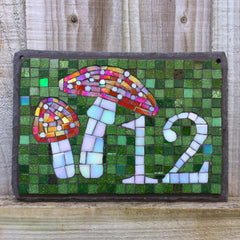 Mosaic house name in rainbow tiles. you can't tell from the photo but the lettering tiles are all glittery.