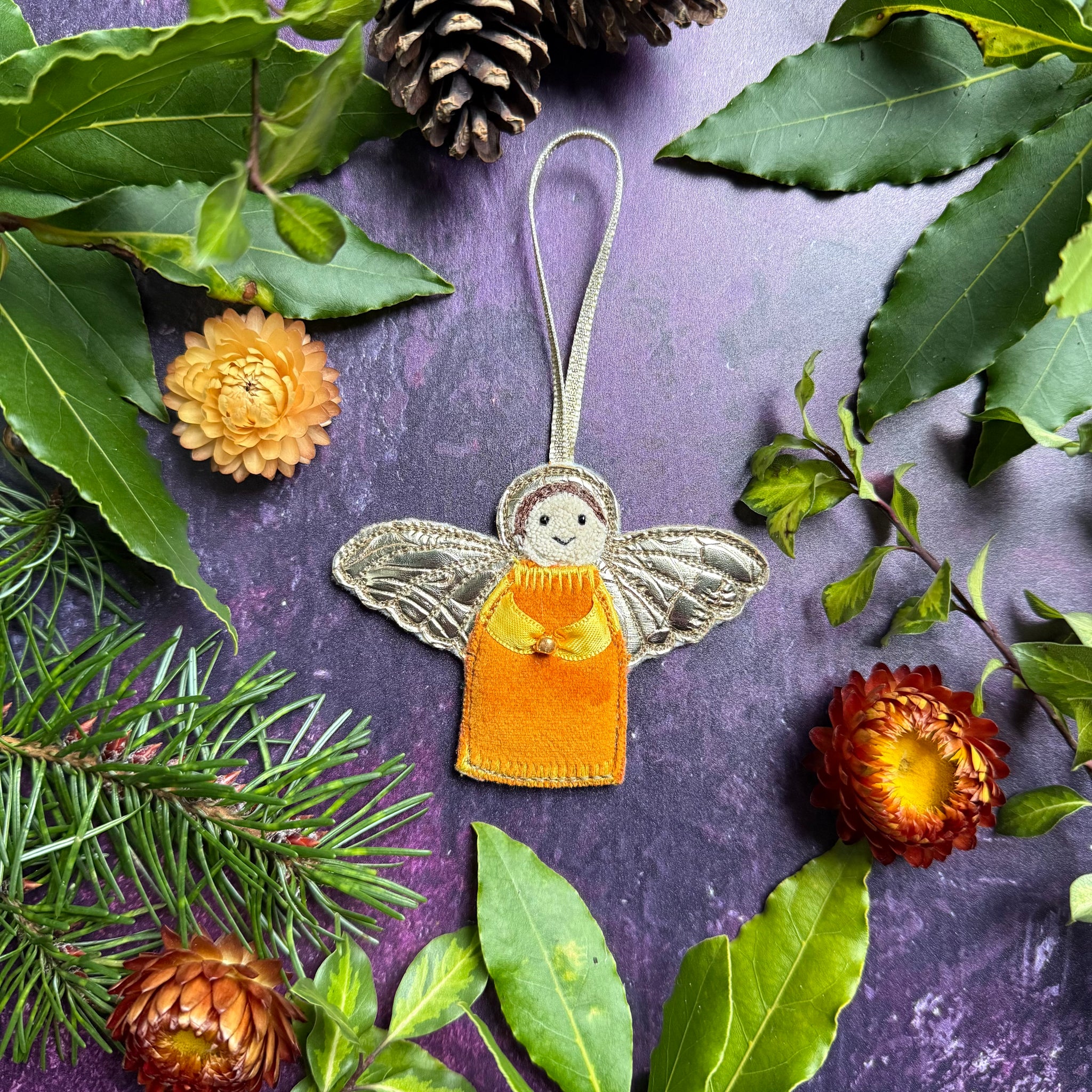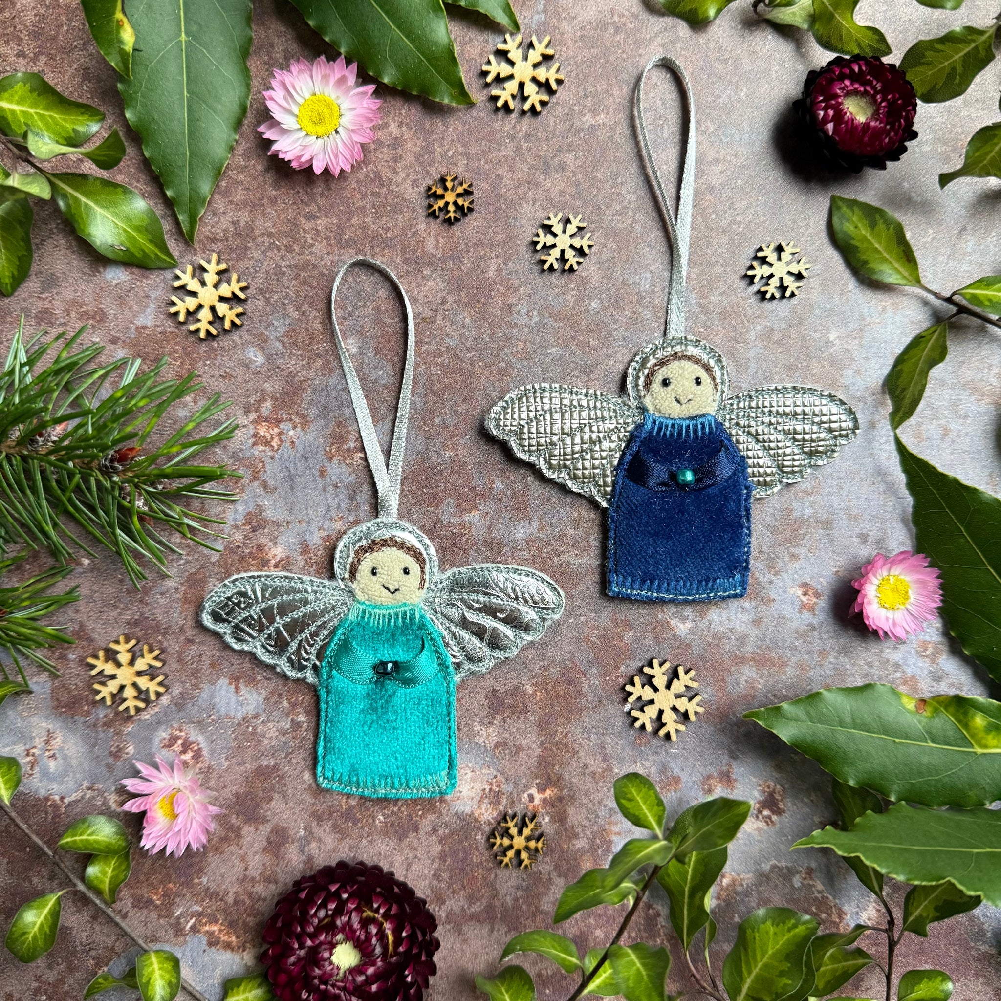 The Angels are decorated using free motion embroidery with glass beads for the eyes and a hand stitched mouth. The arms are ribbon and holding a glass bead.