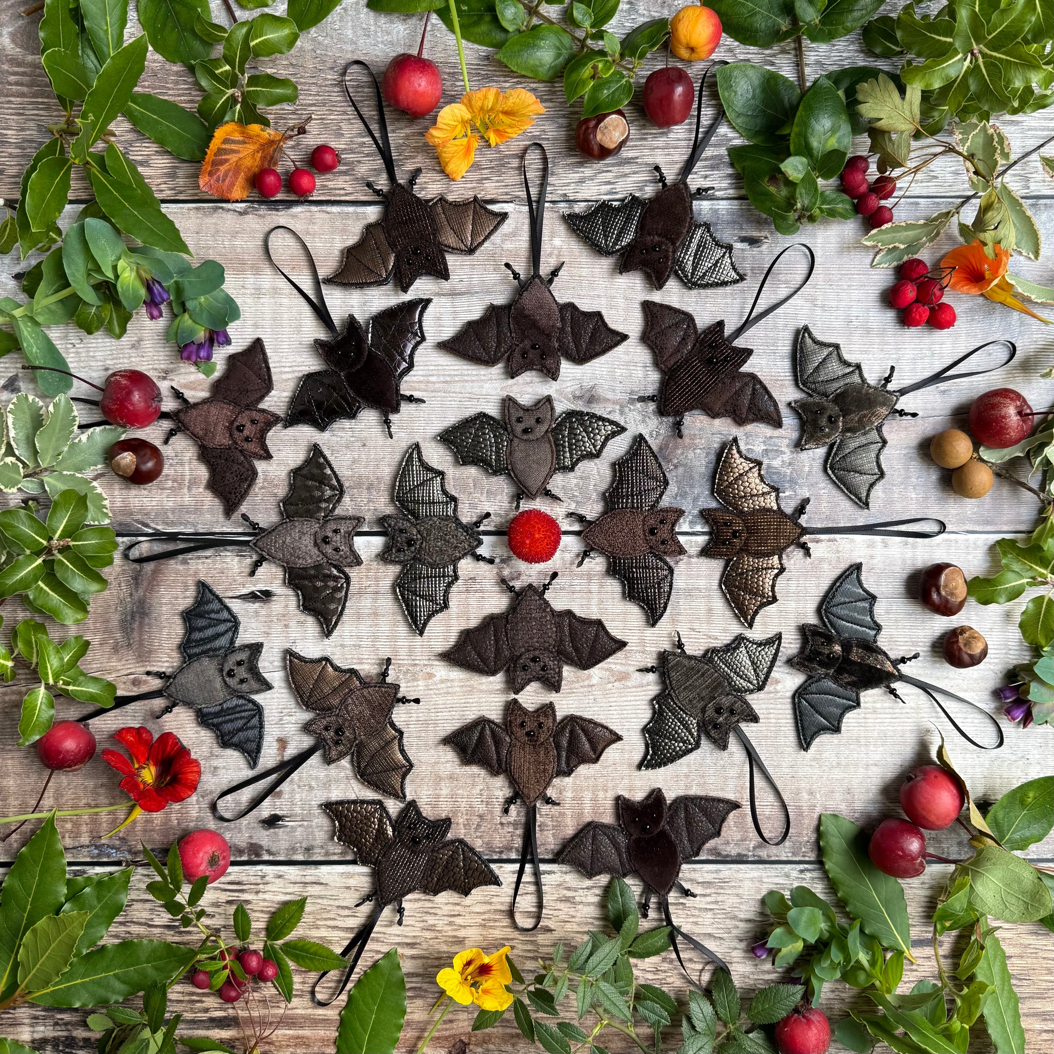 The Bats are decorated using free motion embroidery with glass beads for the eyes and nose.