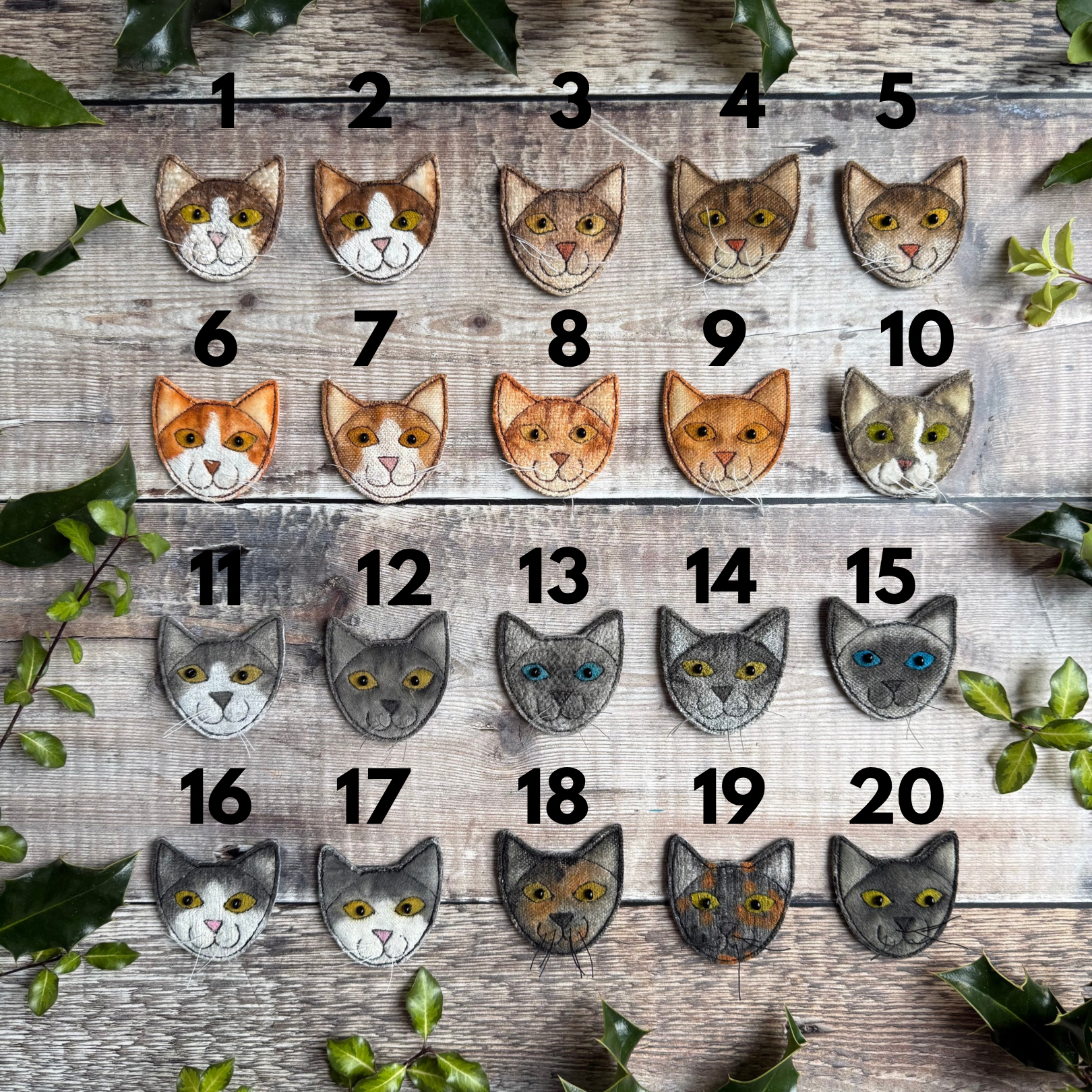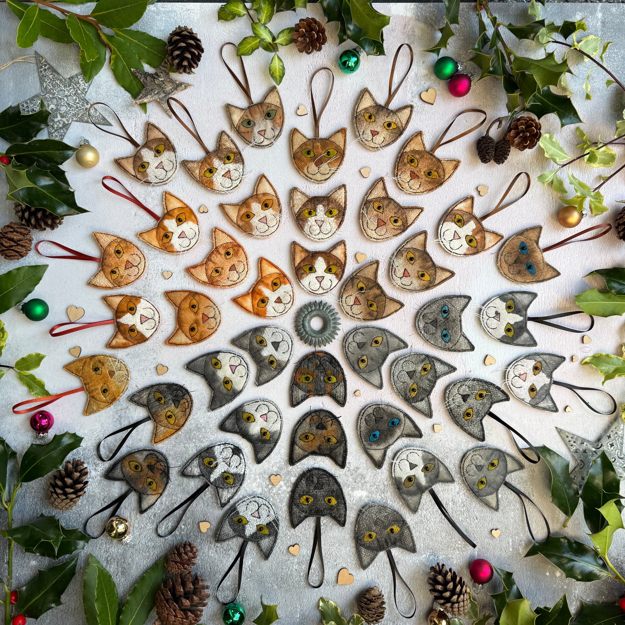 The cats are decorated with machine embroidery, a glass bead for an eye, threads for whiskers  and decorated with acrylic paint.