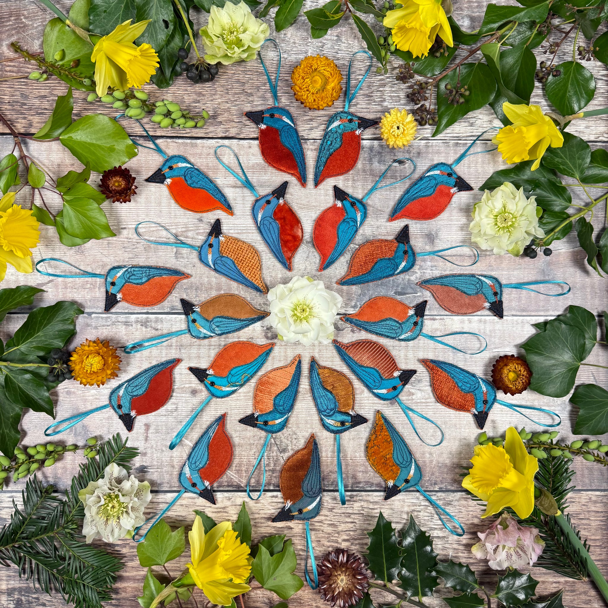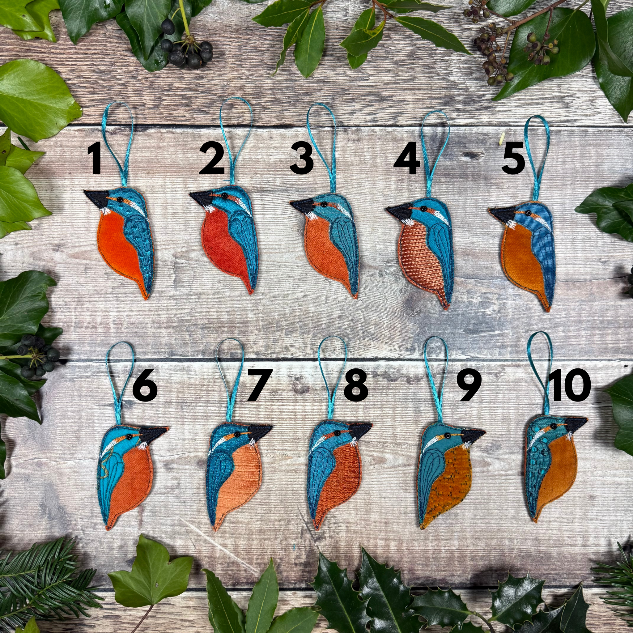 The Kingfishers are decorated with machine embroidery and a glass bead for an eye.
