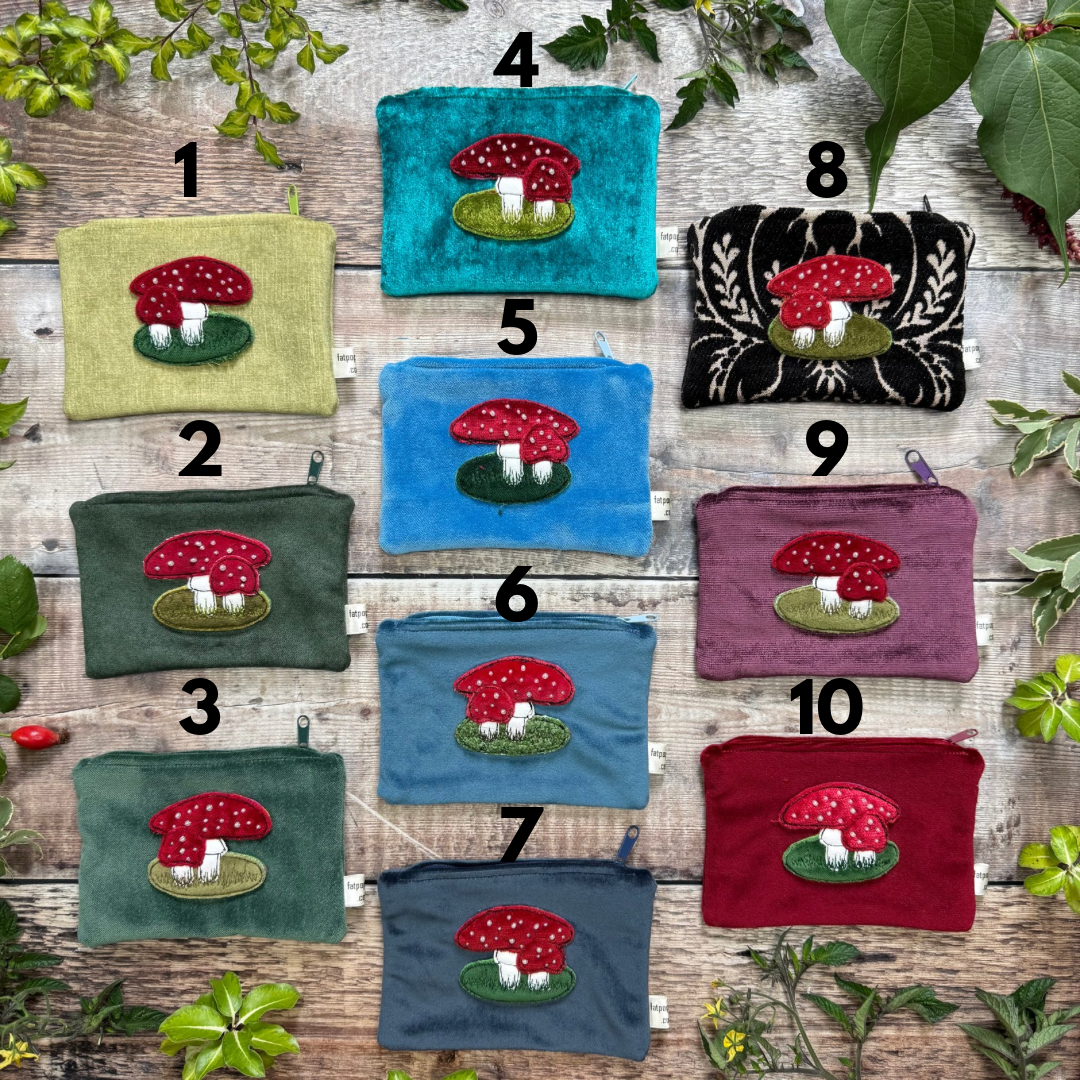 Each one is embellished with fabric mushrooms, again all from fabric that was going to be thrown away. They are decorated with glass beads and free motion embroidery. As I only get small quantities of each fabric it means each one is unique. Just use the drop down menu to pick your favourite. See pictures for the corresponding numbers.